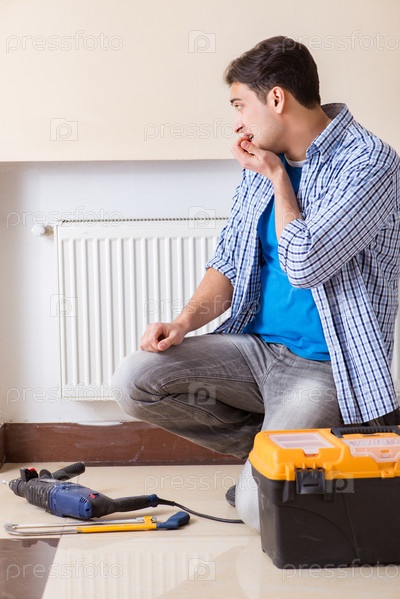 Молодой подрядчик-ремонтник ремонтирует отопительную панель