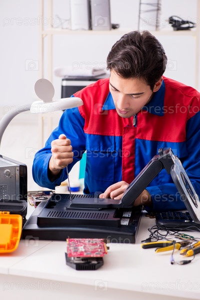 Профессиональный ремонтник, ремонтирующий компьютер в мастерской