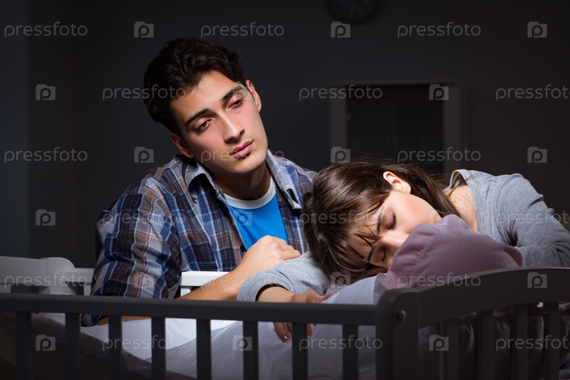 Молодые родители без сна с новорожденным ребенком ночью