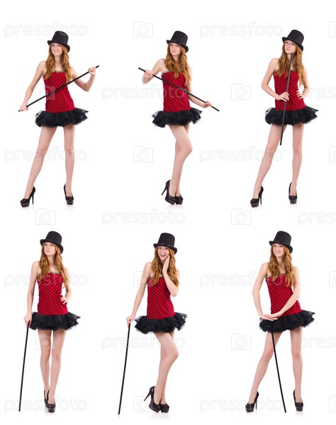 Девушка в красном платье с точками изолирована на белом