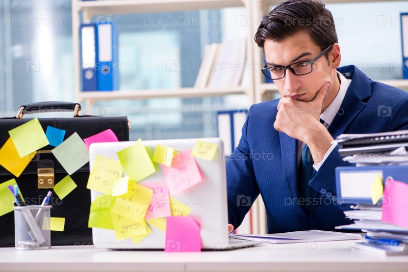 Бизнесмен с напоминаниями о концепции многозадачности