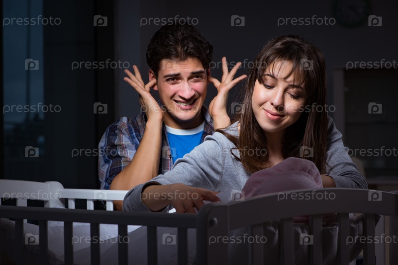 Молодые родители без сна с новорожденным ребенком ночью