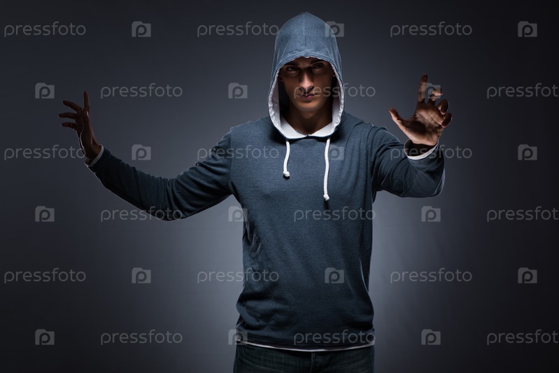 Молодой человек в капюшоне нажимает виртуальные кнопки