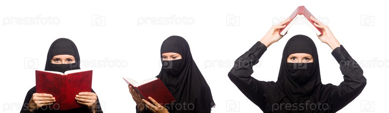 Мусульманская женщина с книгой изолирована на белом