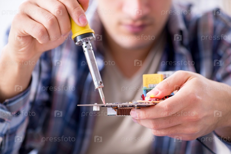Профессиональный ремонтник, ремонтирующий компьютер в мастерской
