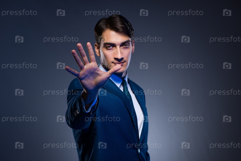 Бизнесмен нажимает виртуальные кнопки на сером фоне