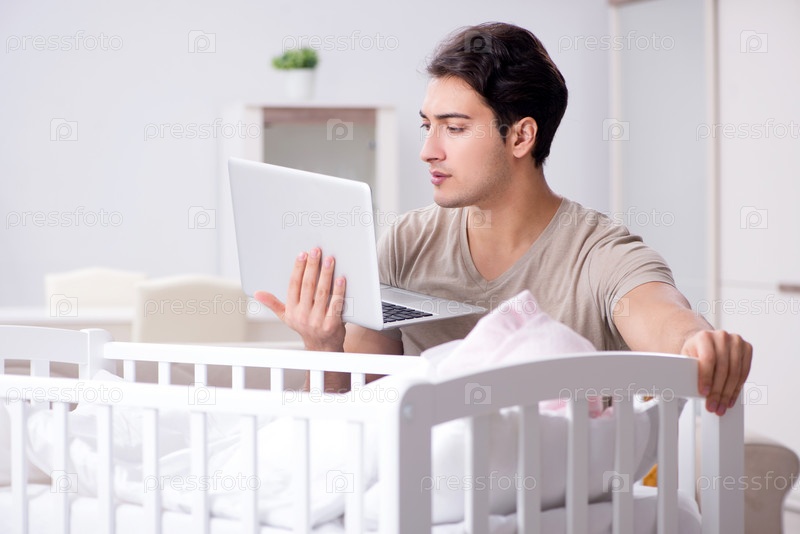 Молодой отец-студент, готовящийся к экзаменам и присматривающий за ребенком