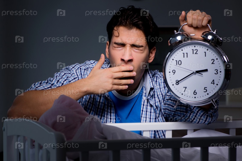 Молодой отец-отец спит, присматривая за новорожденным ребенком