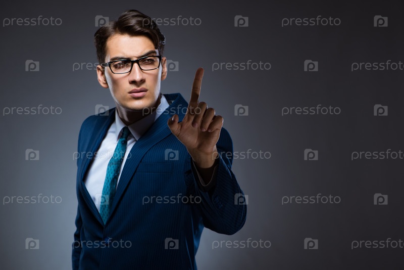 Бизнесмен нажимает виртуальные кнопки на сером фоне