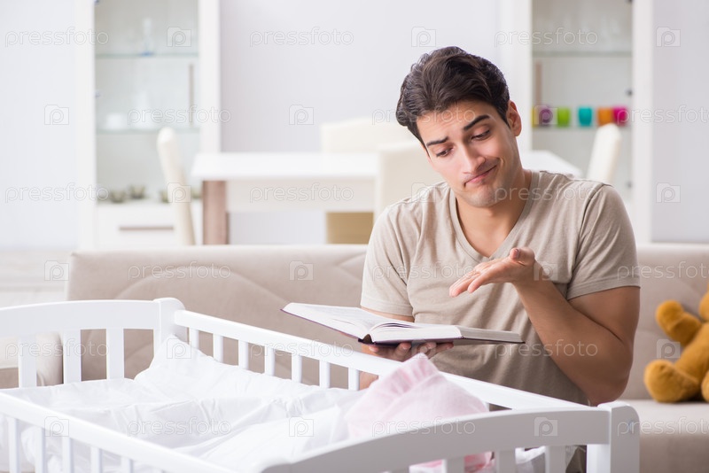 Молодой отец-студент, готовящийся к экзаменам и присматривающий за ребенком