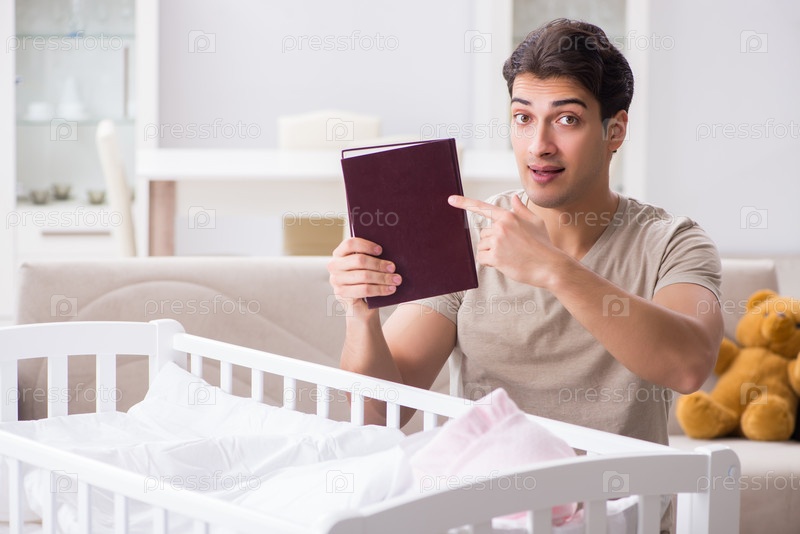 Молодой отец-студент, готовящийся к экзаменам и присматривающий за ребенком