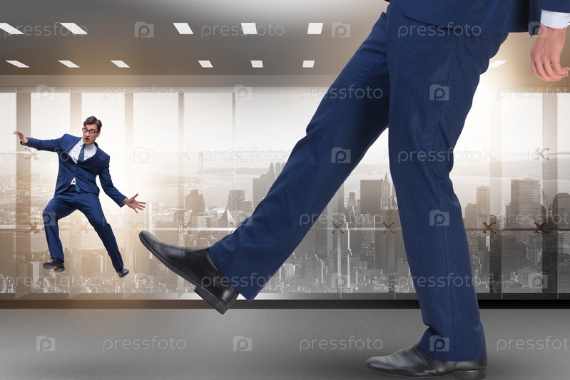 Плохой сердитый босс пинает сотрудника в бизнес-концепции