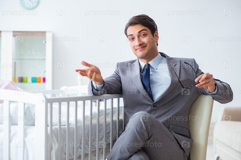 Молодой бизнесмен пытается работать из дома, заботясь о новорожденном ребенке