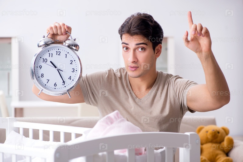 Молодой папа с часами возле новорожденной детской кроватки