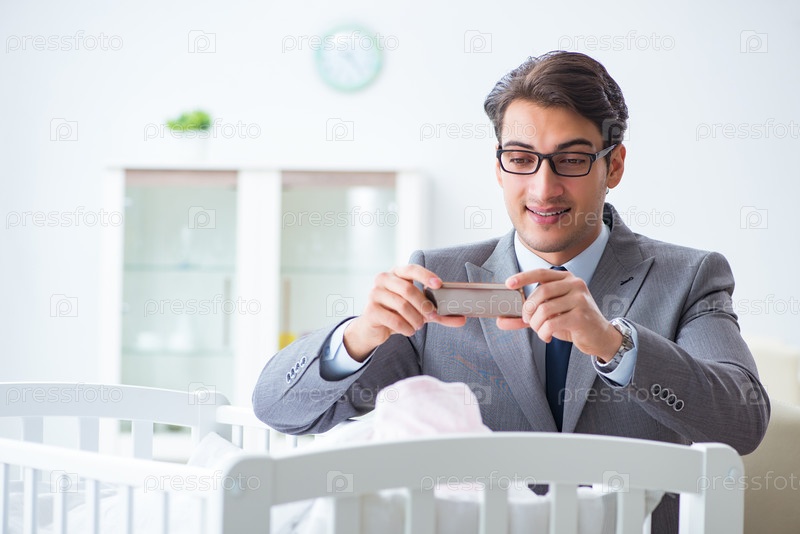 Молодой бизнесмен пытается работать из дома, заботясь о новорожденном ребенке
