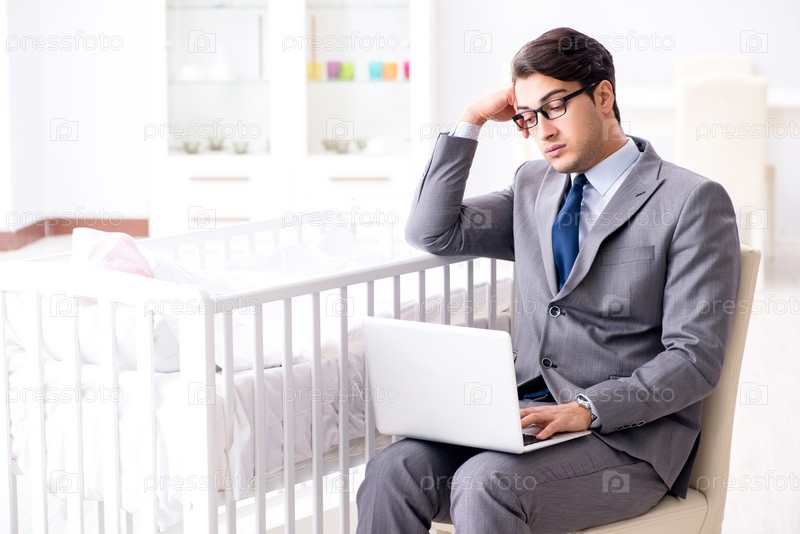 Молодой бизнесмен пытается работать из дома, заботясь о новорожденном