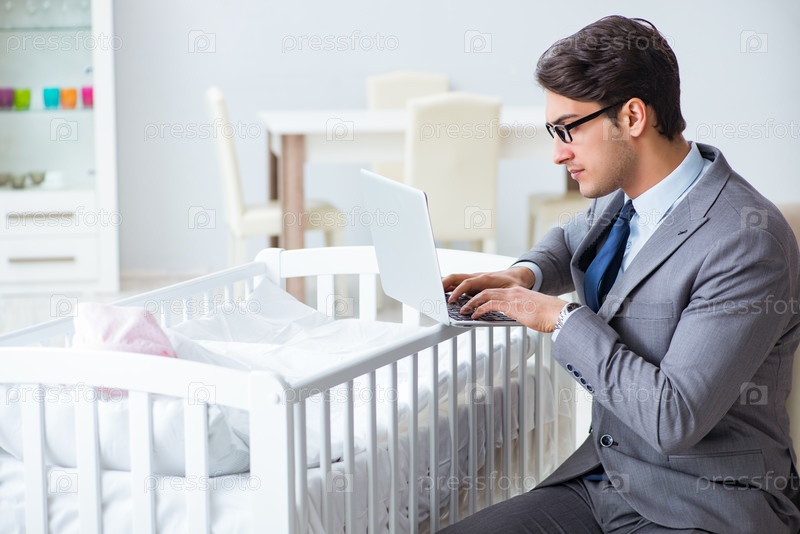Молодой бизнесмен пытается работать из дома, заботясь о новорожденном ребенке