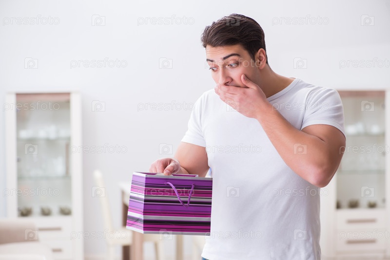 Молодой человек с подарочной сумкой дома готовит сюрприз для жены