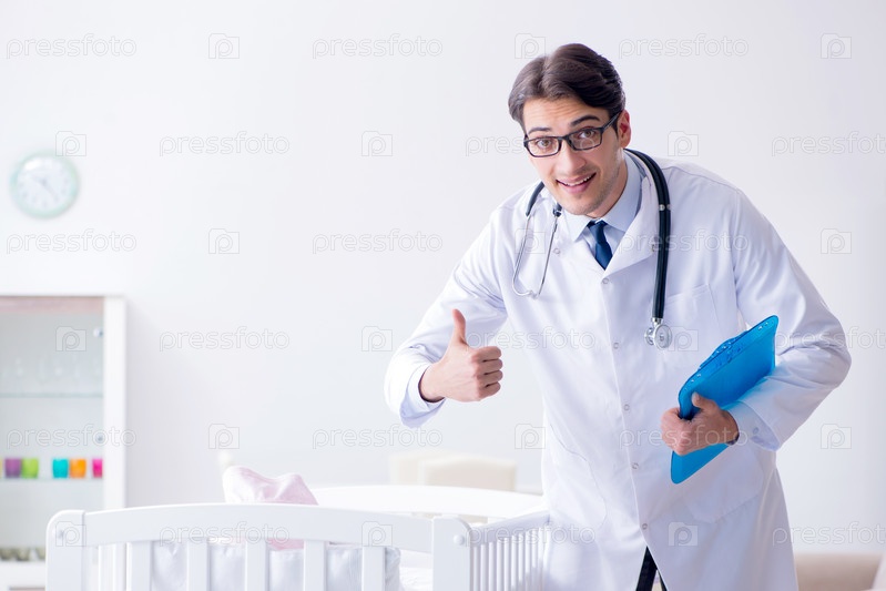 Мужчина мужской педиатр возле детского кровати готовится к обследованию