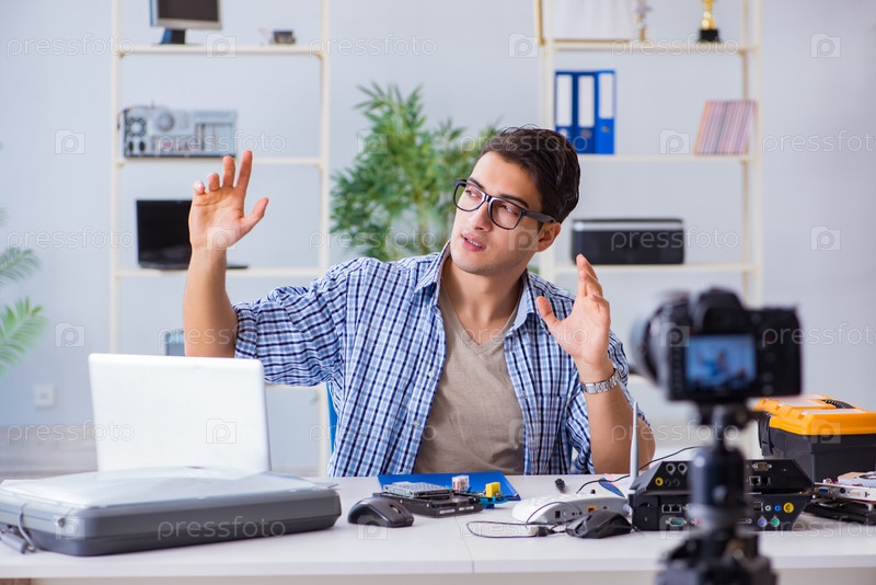 Влогер записывает ремонт компьютера на камеру для блога влогов