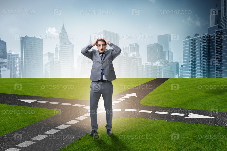 Молодой бизнесмен на перекрестке в концепции неопределенности