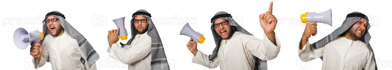 Арабский мужчина с громкоговорителем изолирован на белом