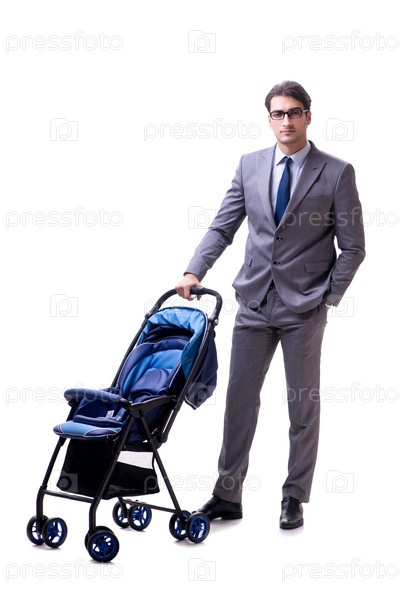 Молодой отец бизнесмен с детской колясочкой, изолированной на белом