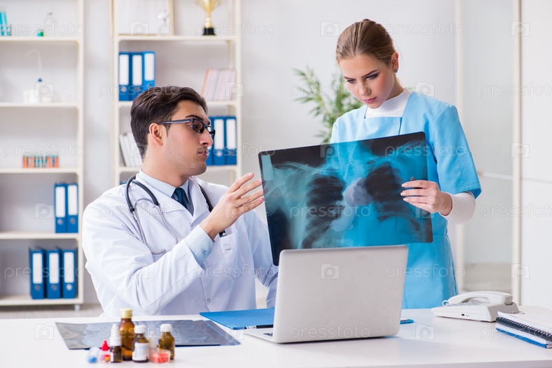 Два врача изучают рентгеновские снимки пациента для постановки диагноза