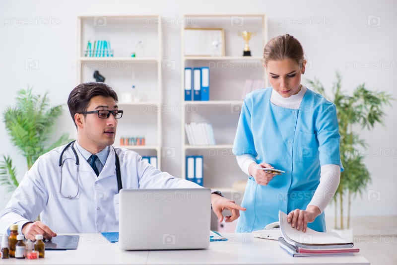 Врач и женщина обсуждают в больнице мужчину и женщину