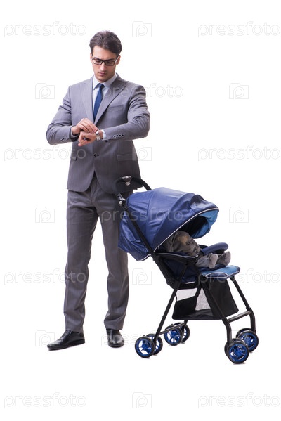 Молодой бизнесмен кормит ребенка грудью в детской коляске изолированный на белом