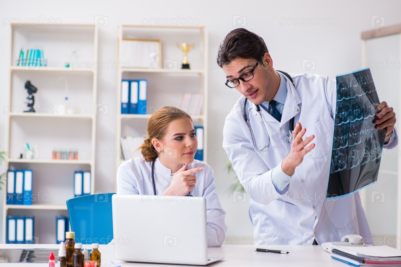 Два врача изучают рентгеновские снимки пациента для постановки диагноза