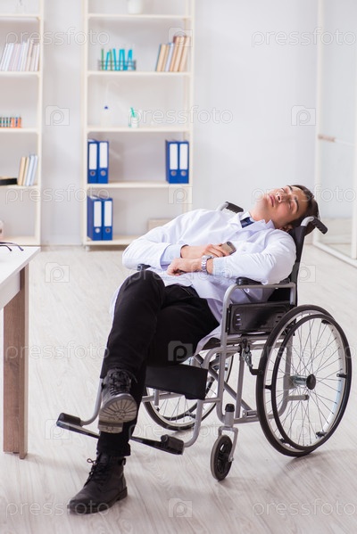 Врач, отдыхающий на инвалидном кресле в больнице после ночной смены