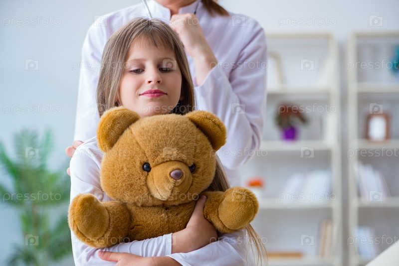 Женщина женщина-врач осматривает маленькую милую девочку с игрушечным медведем
