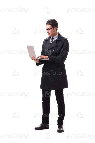 Молодой бизнесмен с ноутбуком, изолированным на белом фоне