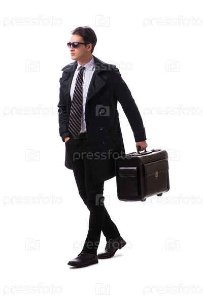 Молодой бизнесмен с чемоданом, готовым к деловой поездке на белом
