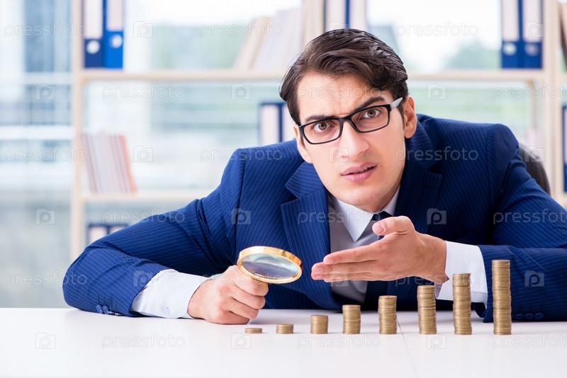 Бизнесмен с кучей монет в офисе