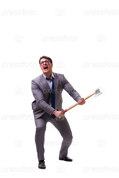 Разгневанный бизнесмен с топором, изолированным на белом