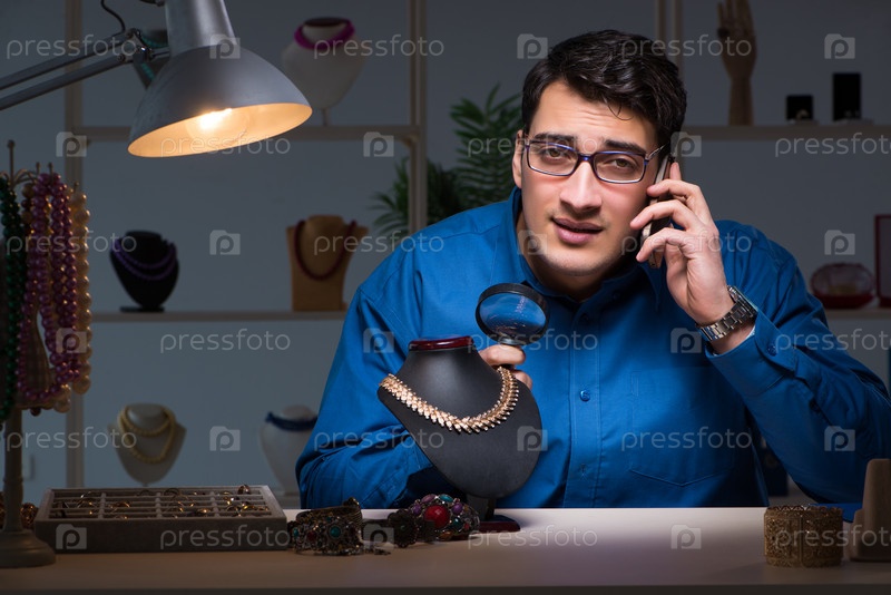 Ювелир работает в своей мастерской поздно ночью
