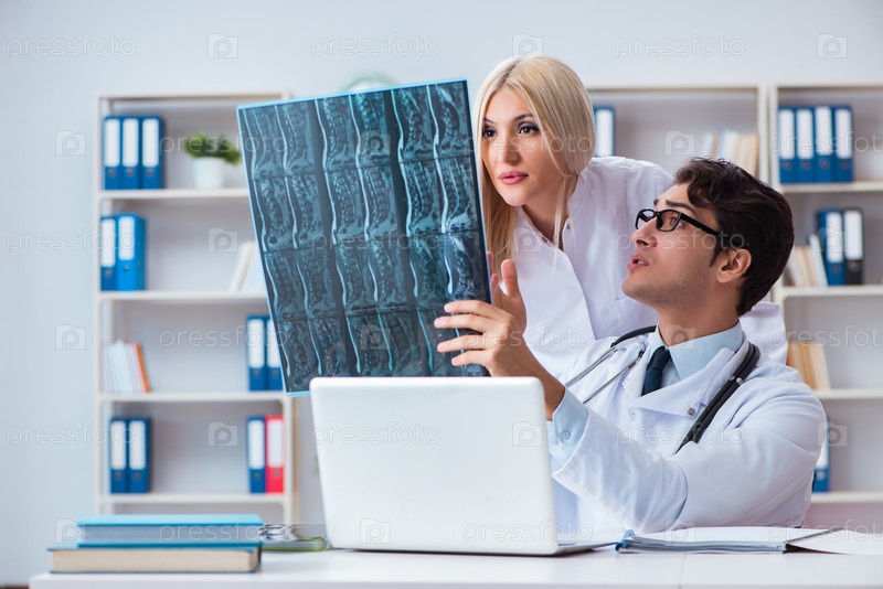Два врача изучают рентгеновские снимки пациента для постановки диагноза