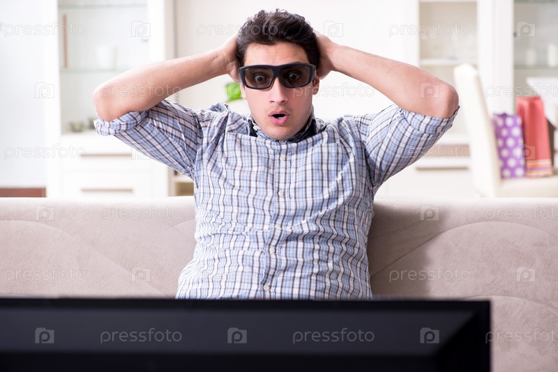 Мужчина смотрит 3D-телевизор дома