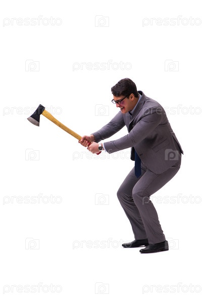 Разгневанный бизнесмен с топором, изолированным на белом