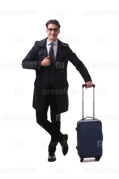 Молодой бизнесмен с чемоданом, готовым к деловой поездке на белом