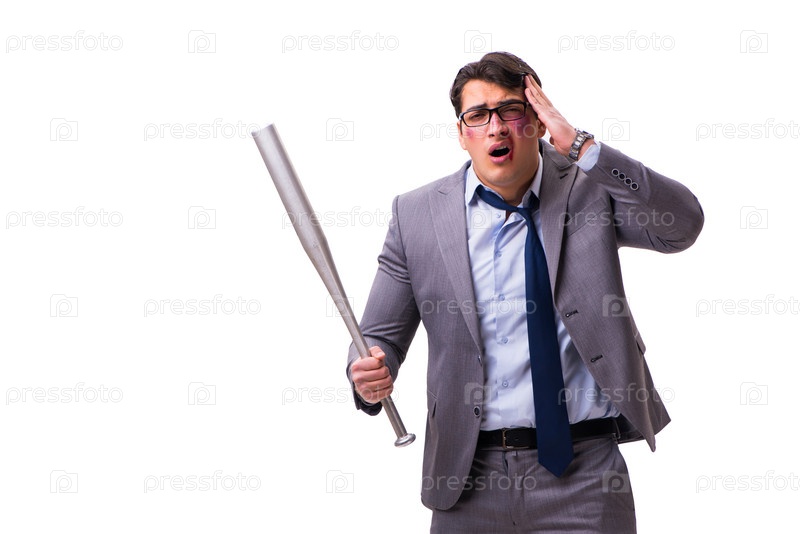 Бизнесмен с бейсбольной битой, изолированной на белом