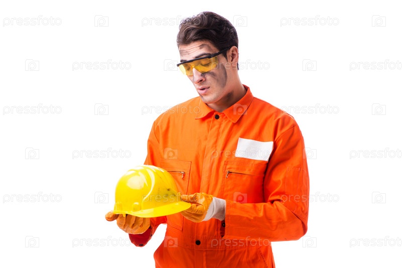 Сотрудник подрядчика в комбинезонах, изолированных на белом