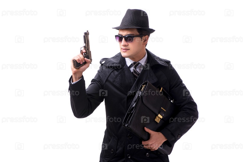 Мужчина-шпион с пистолетом изолирован на белом фоне