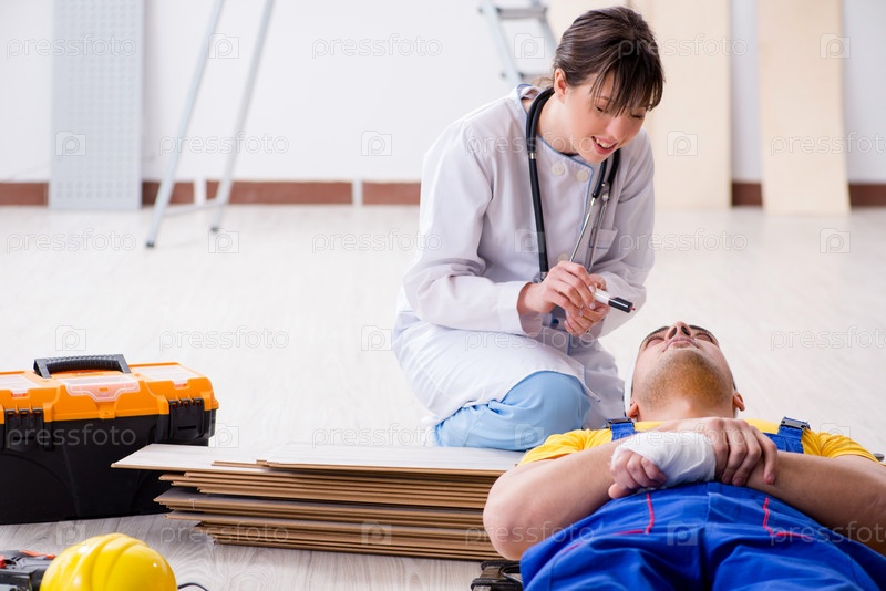Врач помогает раненому работнику на строительной площадке