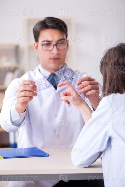 Врач проверяет гибкость суставов пациентов с помощью гониметра