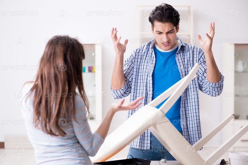 Жена помогает мужу починить разбитый стул дома