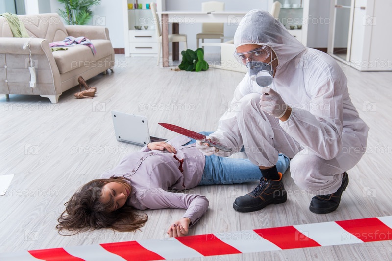 Судебный следователь на месте преступления расследует убийство женщины