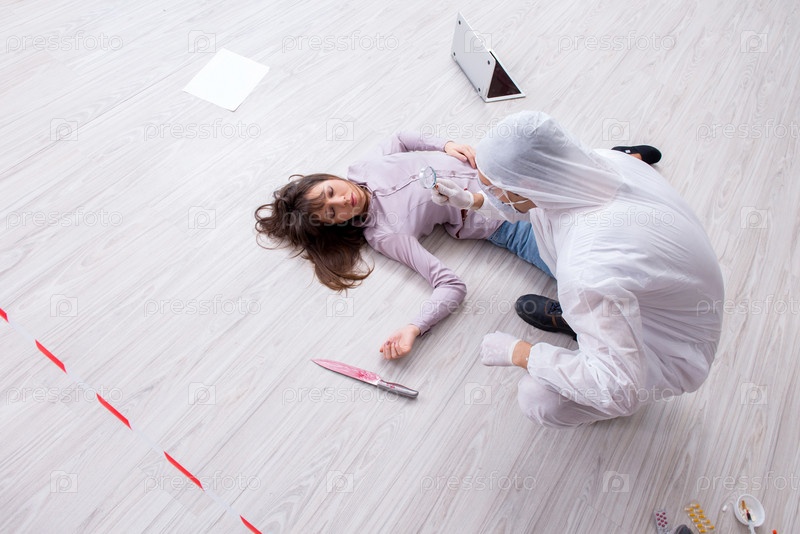 Судебный следователь на месте преступления расследует убийство женщины